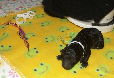 Rüde mit grünem Kennzeichnungsband. Am zusammengenähten Gummiband wird ein farbiger Wollfaden eingeknotet, das reicht für die nächsten Tage. Danach gibt es Welpenhalsbänder.